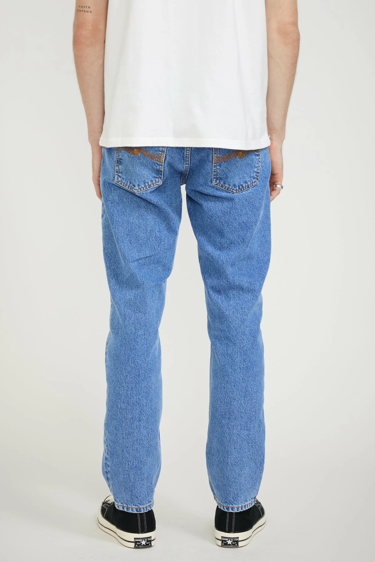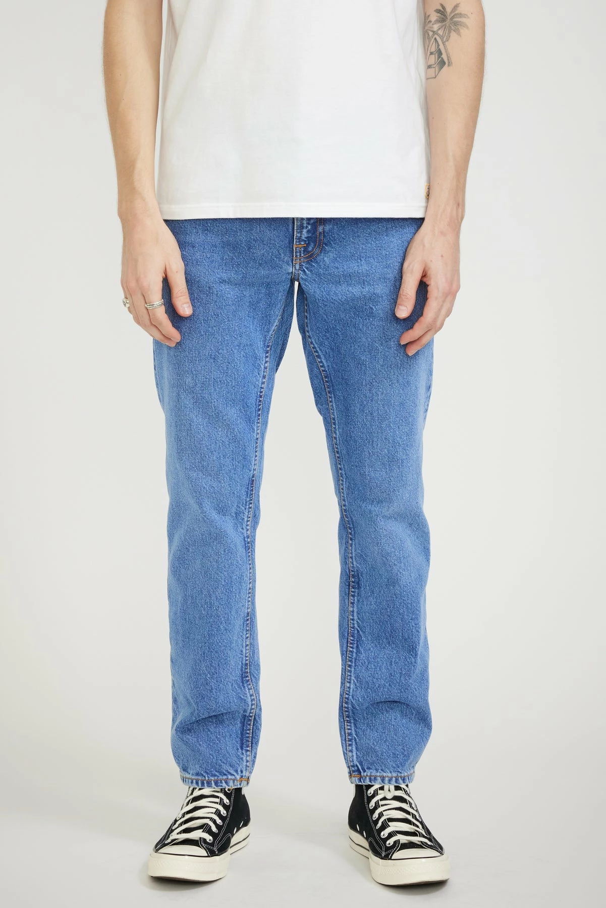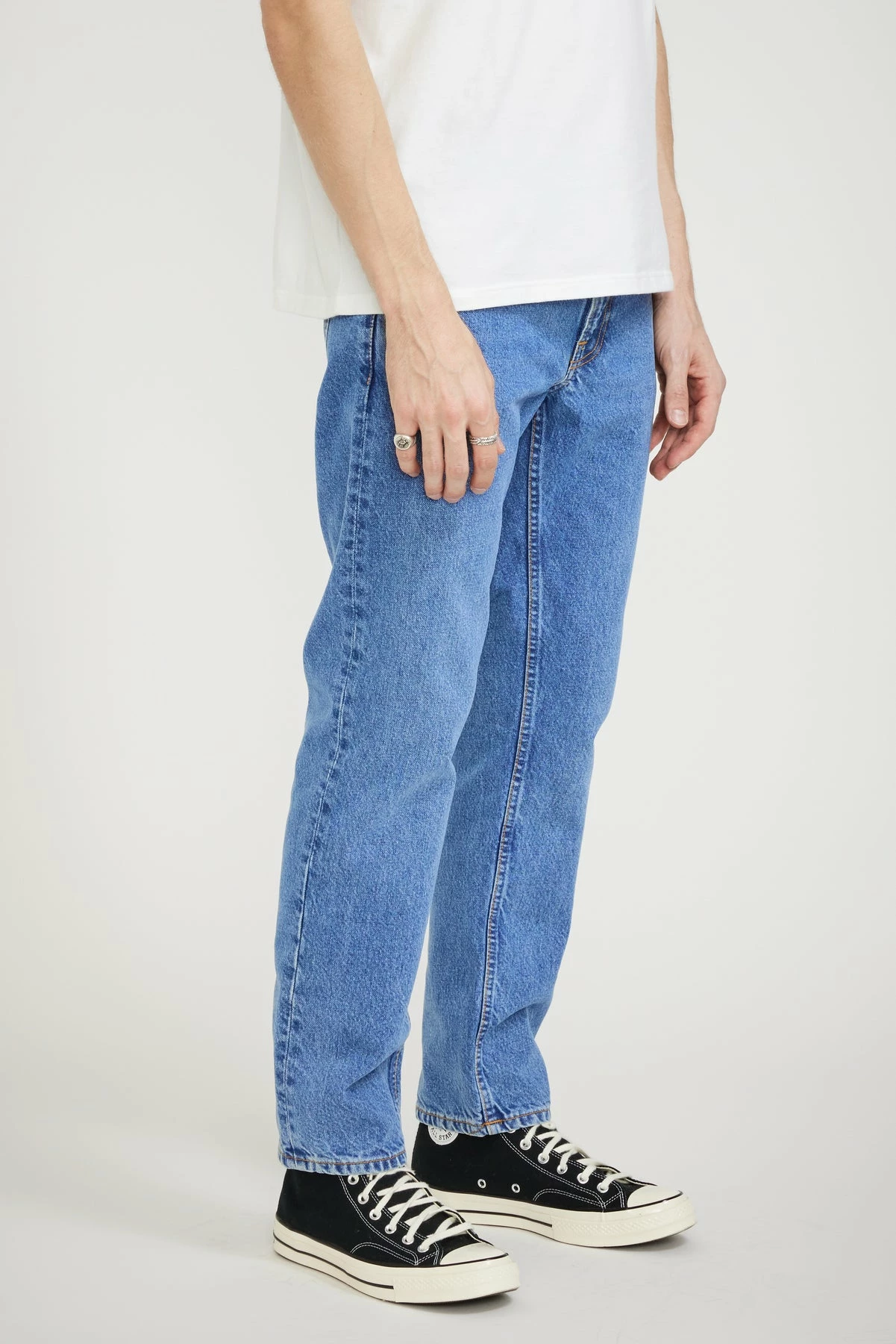 The Gritty Jackson from Nudie Jeans is a regular fit jean with a straight leg, made in organic rigid denim. These jeans are made from denim consisting of 80% organic cotton and 20% recycled cotton. The stonewash creates soft contrasts at the seams and reveals the diagonal twill lines of the textured denim.