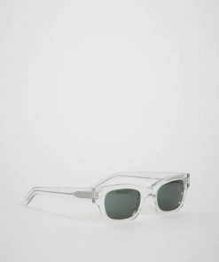 The Lubna in Crystal from Sun Buddies are a transparent sporty slightly thicker frame handmade of Italian acetate. Fitted with Green/G15 Carl Zeiss lenses with 100% UV protection and a seven bar hinge with two visible rivets on the temple.