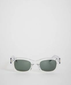 The Lubna in Crystal from Sun Buddies are a transparent sporty slightly thicker frame handmade of Italian acetate. Fitted with Green/G15 Carl Zeiss lenses with 100% UV protection and a seven bar hinge with two visible rivets on the temple.