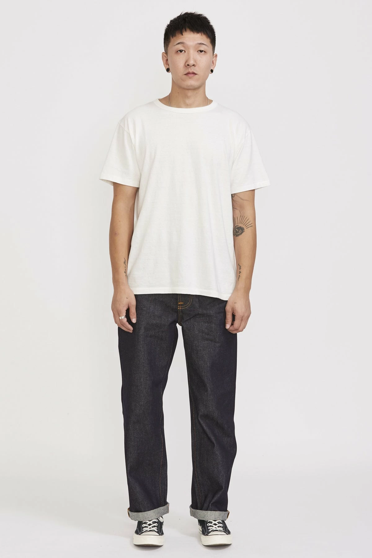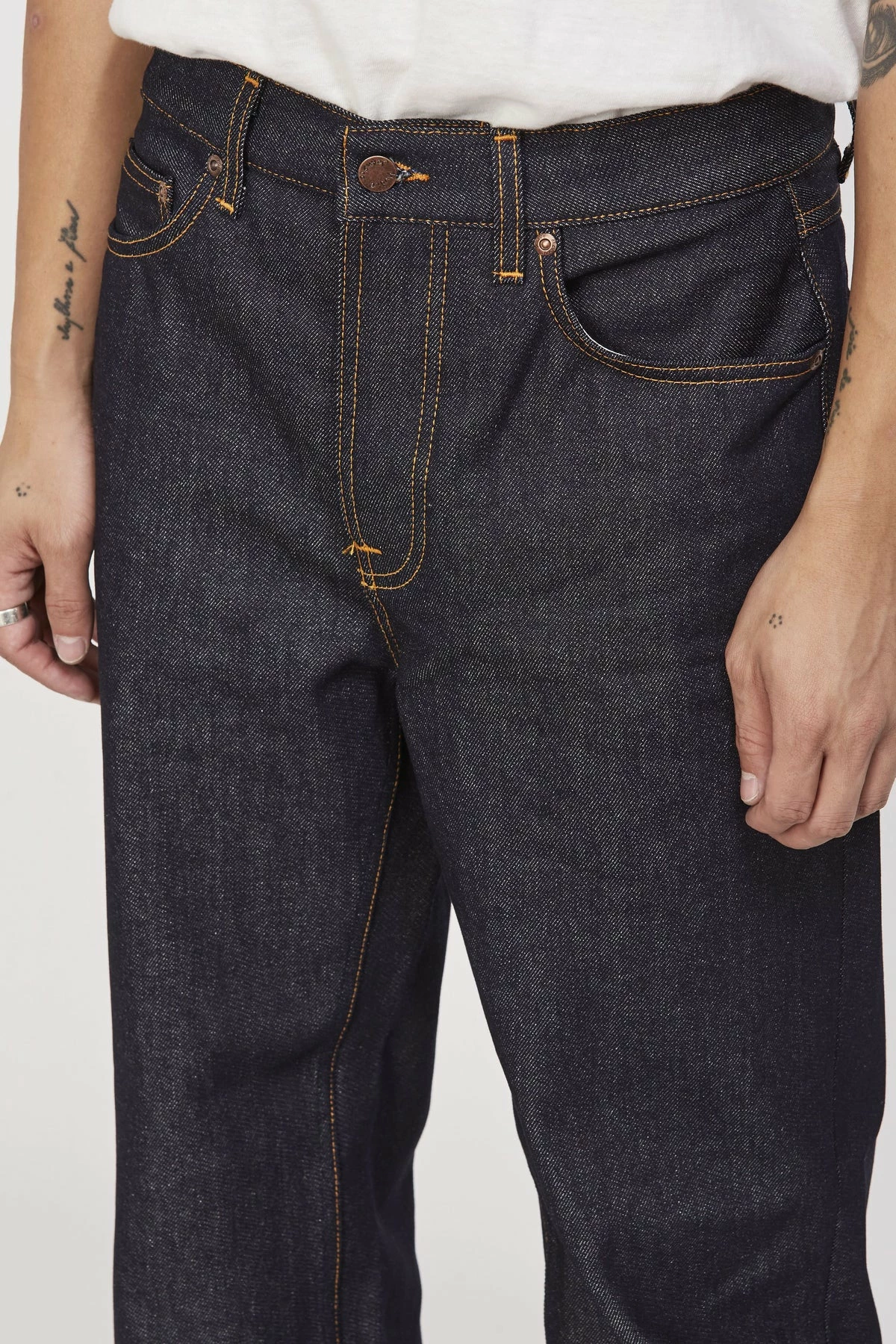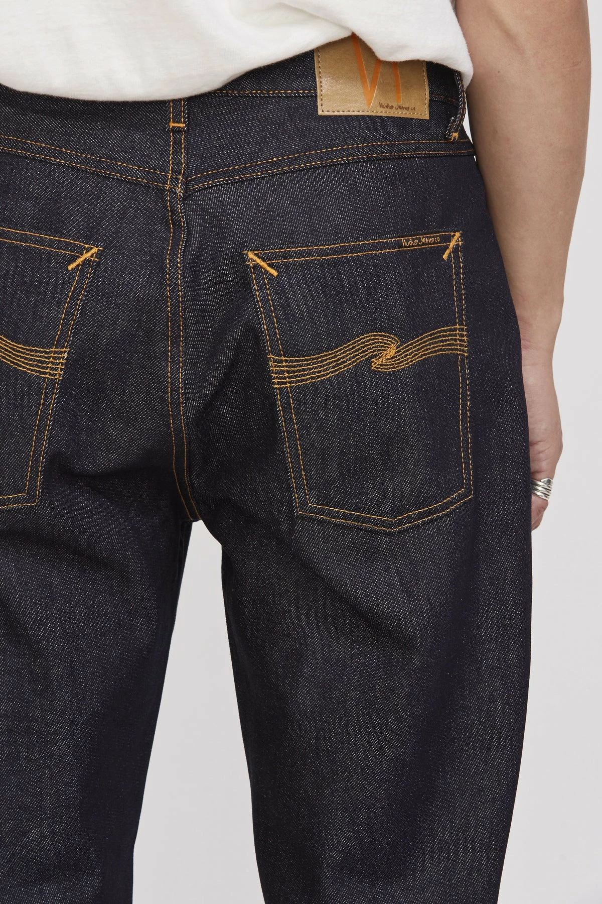 Introducing Tuff Tony. A relaxed fit jeans with a straight leg made in organic denim. For Nudie’s first dry Tuff Tony’s they’ve used a vintage-like, dark blue 13.2 oz Italian redcast denim with a bunch of character. The denim is woven with fairly regular yarns which gives it clear twill lines and an open structure. This gives the denim its beautiful vintage-like look that with wearing and washing will fade to a clear blue hue, thanks to the redcast. Washing will also change the surface structure of the denim – the yarns will shrink with a slight difference which will create an even richer surface structure.