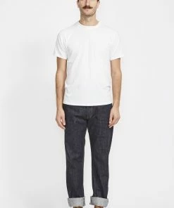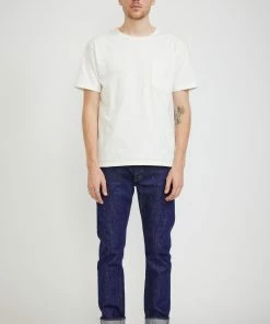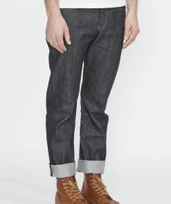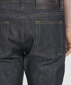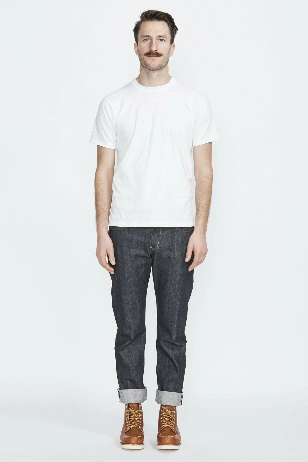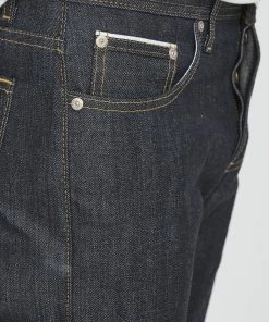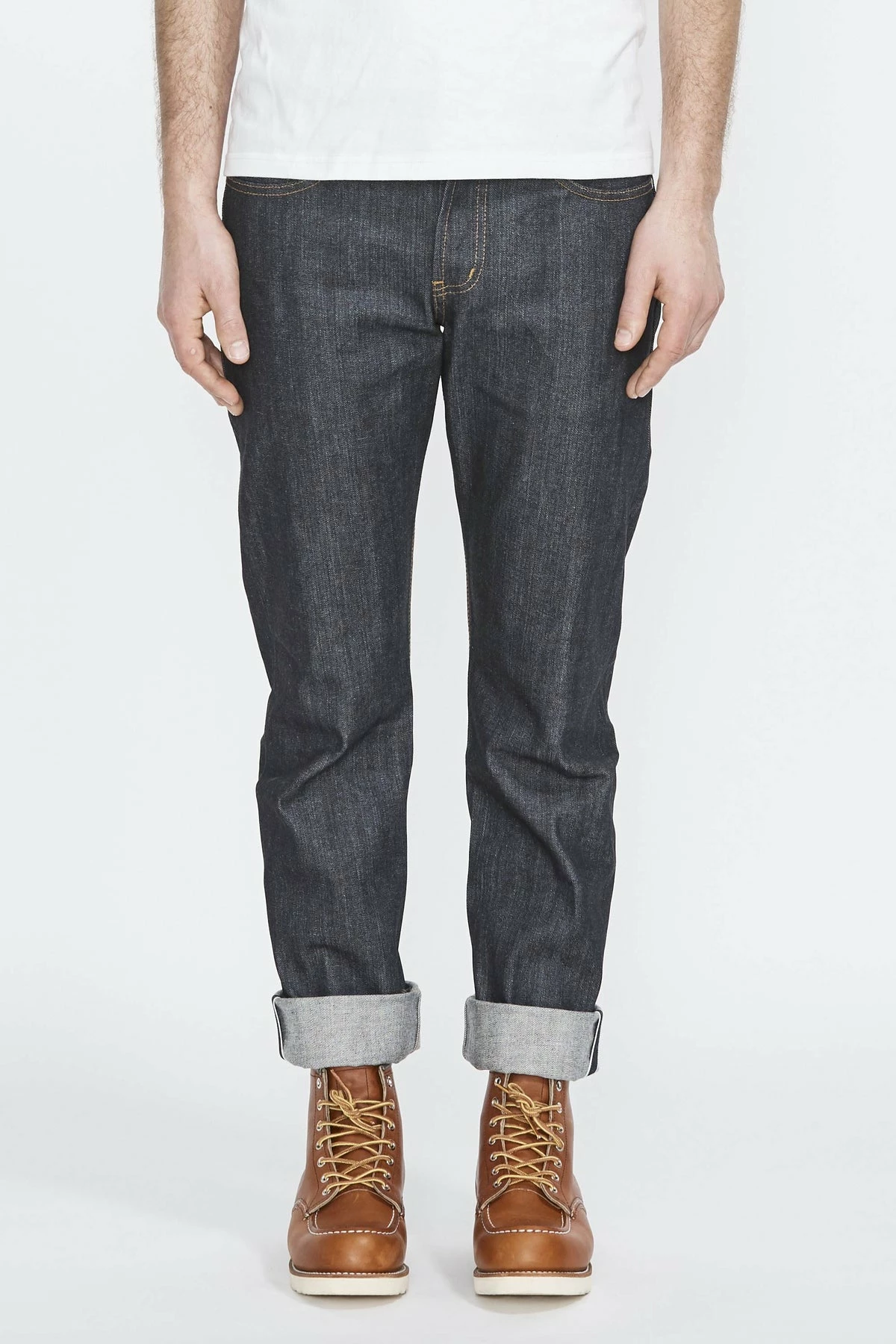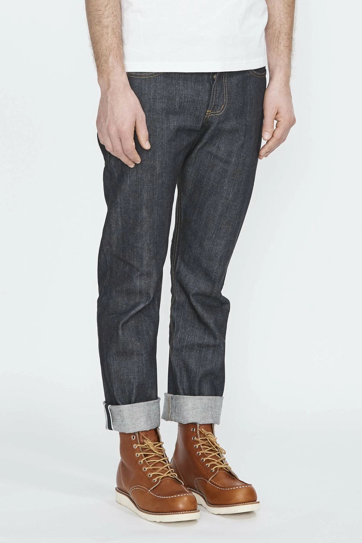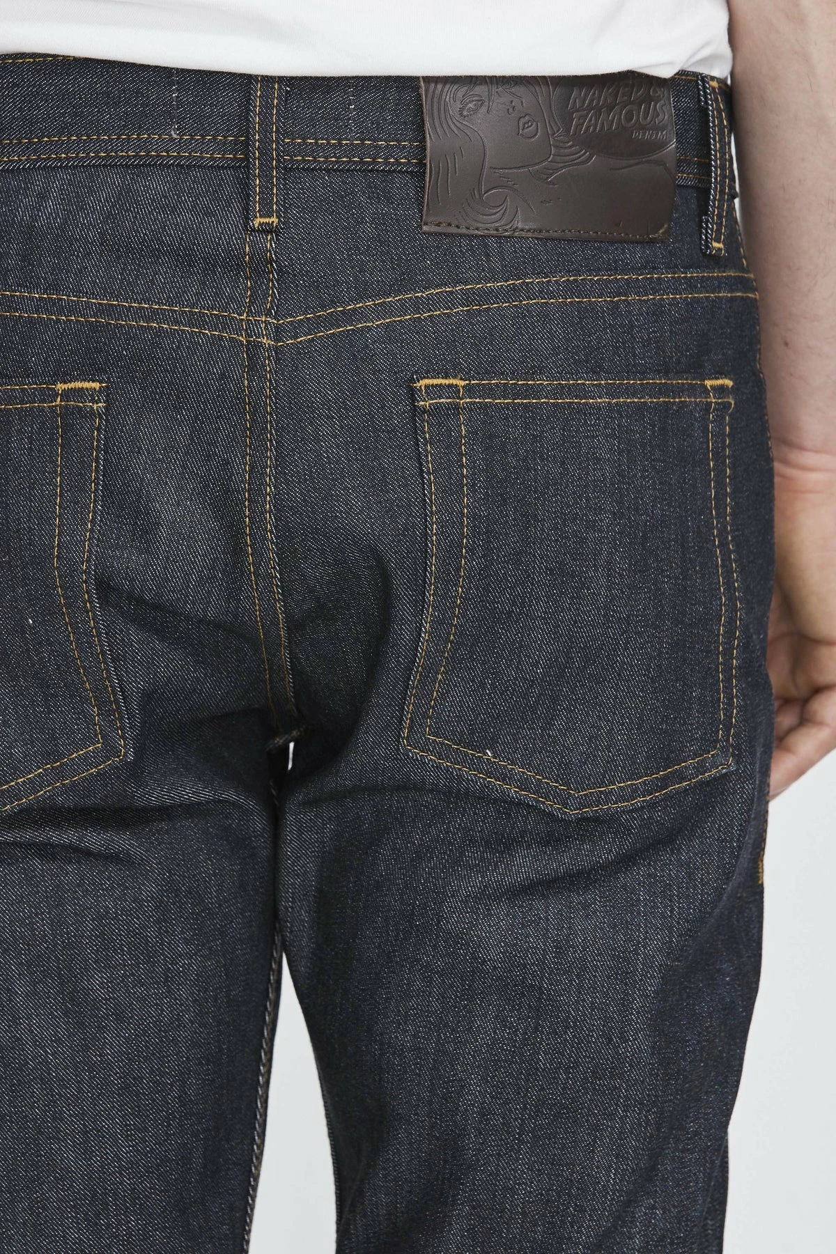 Naked and Famous denim’s best fitting Weird Guy constructed from 13.75 oz Left Hand Twill Selvedge. Woven on vintage shuttle looms in a left hand twill construction which over time will provide a softer feeling denim and will emphasise vertical fading. Other details include contrast stitching, full grain brown leather patch, white selvedge ID, silver metallic buttons and rivets.
